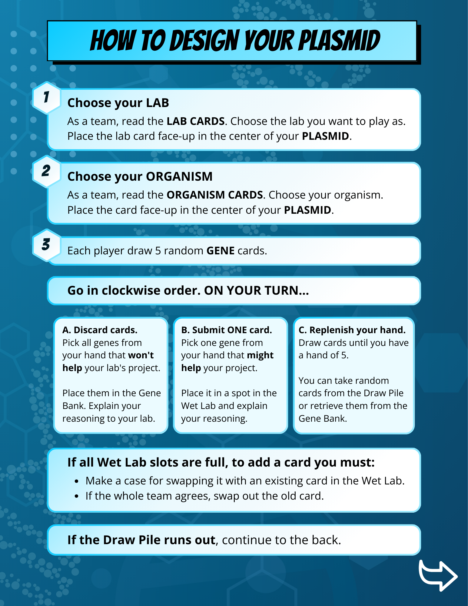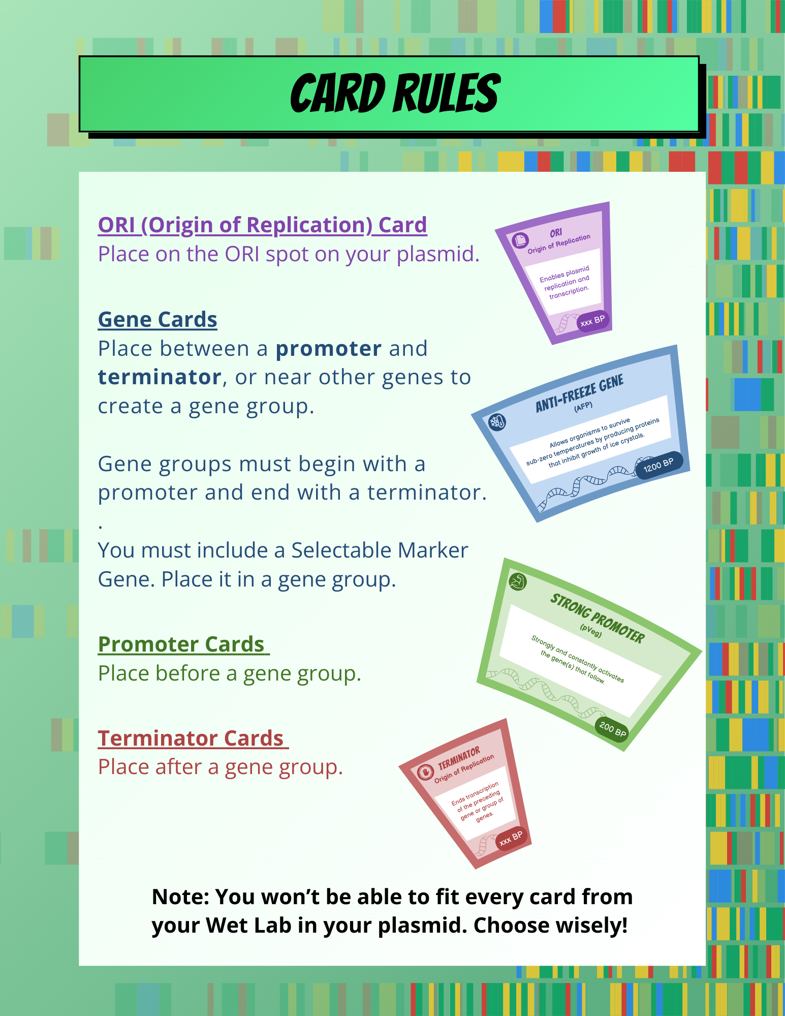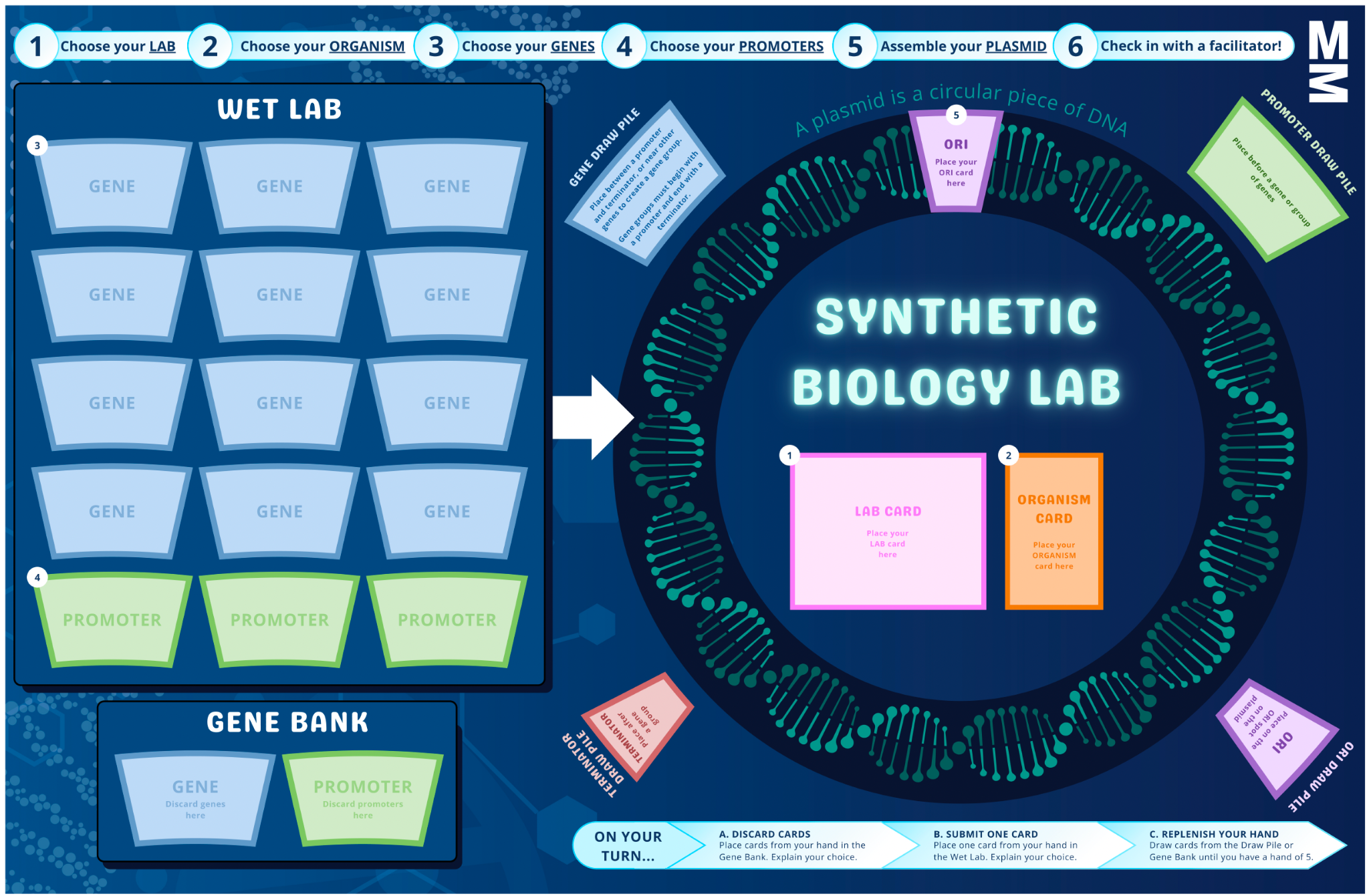 Participants pick a lab card to join, then determine a problem they want to solve and an organism they will engineer to solve it